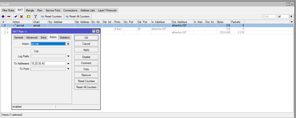 - Action : عملی که قرار است روی آن ترافیک انجام شود، مثل masquerade، src-nat، dst-nat و …